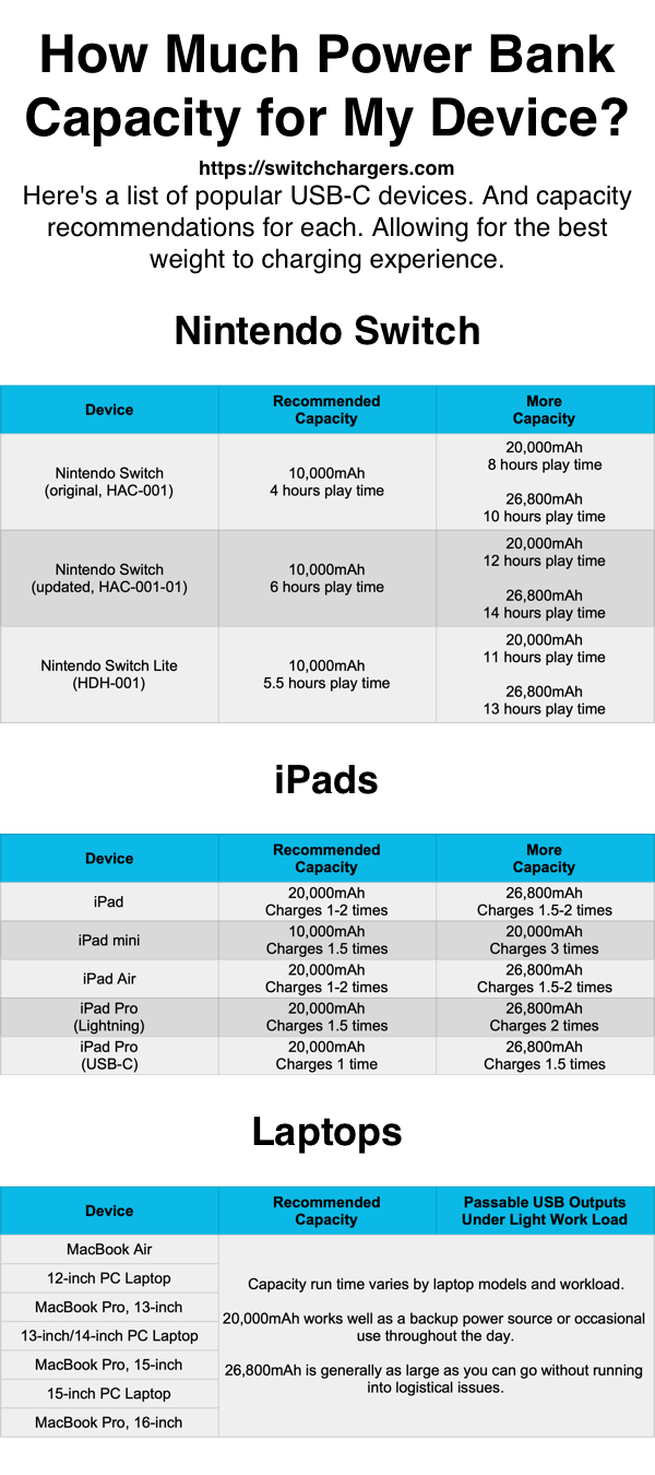 How much capacity (mAh) do I need for Nintendo Switch, iPad, and laptops?