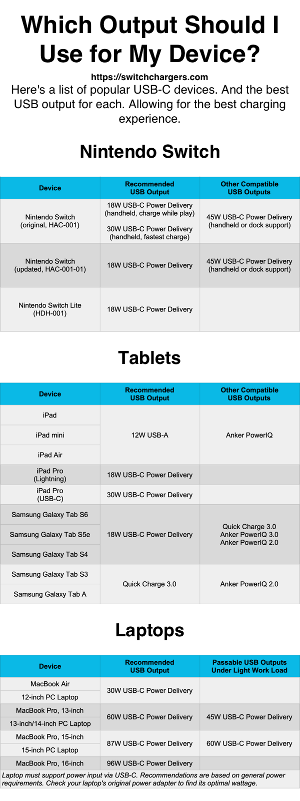 Which output (W) should I use for Nintendo Switch, tablets, and laptops?